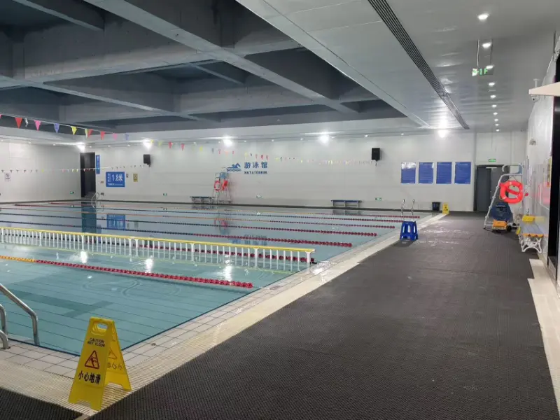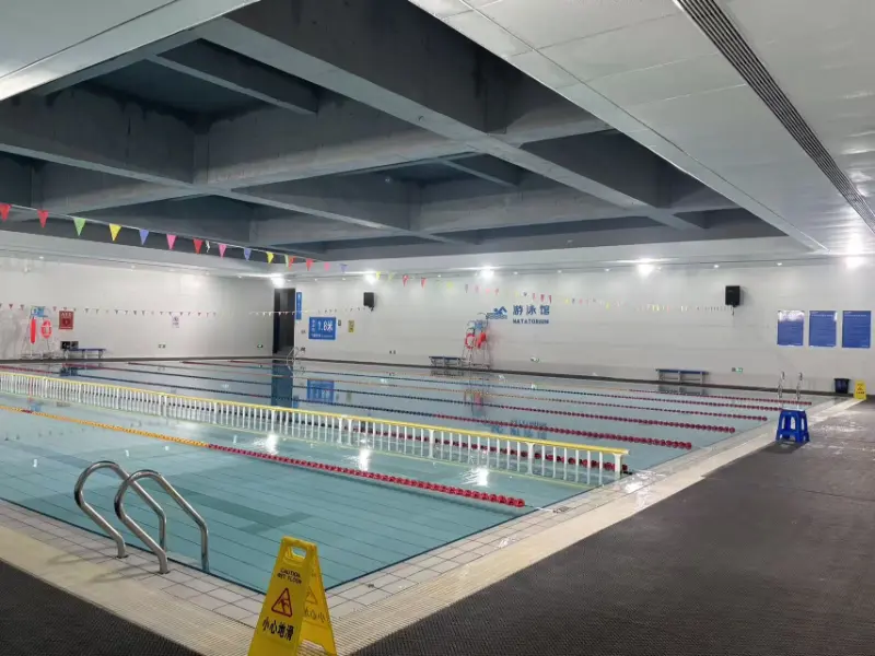 De buitenkant van het zwembad is voorzien van een metalen paneelsysteem met vissenschubben, waardoor een schubachtig licht- en schaduweffect ontstaat dat verandert met de kromming van de gevel en de richting van het zonlicht, waardoor de ‘waterstroom’ wordt versterkt. De gehele dakconstructie van het binnenzwembad is zichtbaar, met een spant van 48 meter, wat de expliciete uitdrukking van structurele logica benadrukt en de ruimtelijke schaal en het gevoel van kracht van de sportlocatie versterkt. De locatie beschikt over twee zwembaden: een wedstrijdbad en een trainingsbad. Het wedstrijdbad is 50 meter lang en 25 meter breed en beschikt over 8 banen; het trainingsbad is 50 meter lang en 17 meter breed, met 6 banen. Beide zwembaden zijn 2 meter diep.